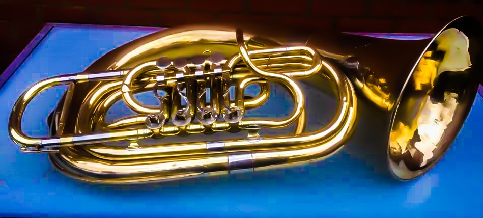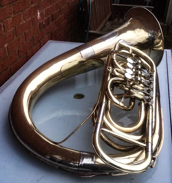 Pre-1920 Leopold Hüttl - Tulln BBb helicon 4RV -- the wrap is of the Herculesophone type - all tubing but for the bell backbow is in front of the player