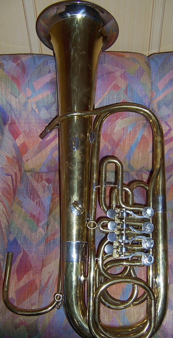 I. K. Gottfried of Copenhagen F-tuba 4RV - very likely the same instrument as above (renovated in Poland, where the technician has added an alternative main tuning slide for the pitch of Eb)